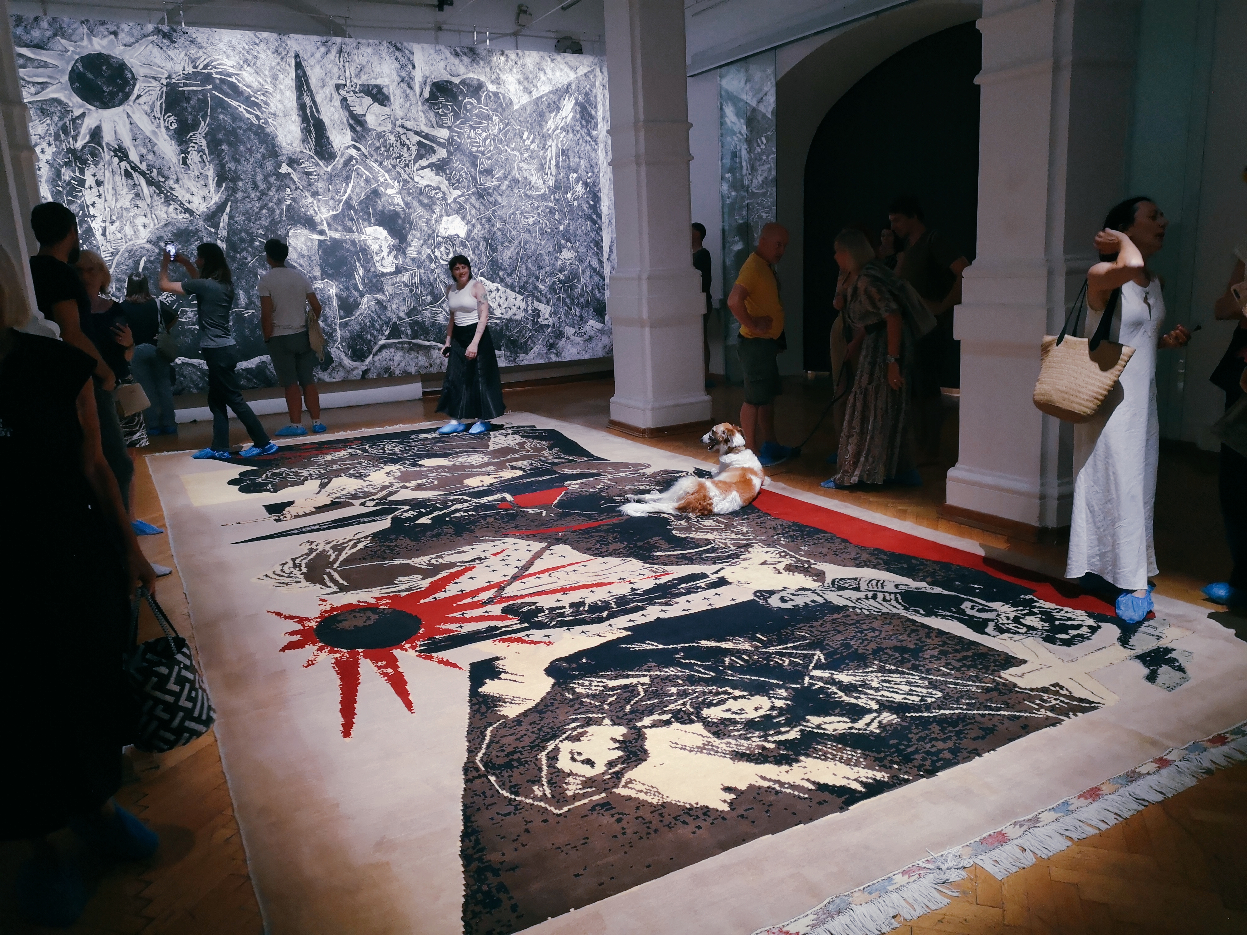 In this case, craftsmanship and the process of creation seem separated from the understanding, feeling or imagining of the image. But—is it really that simple? As an export product of Islamic countries, carpets have for centuries served as a bridge between Eastern and Western cultures. Their method of production was passed down from generation to generation, and the main role in this manual work has traditionally been held by women. Thus today in Afghanistan, carpet-making is one of the rare spaces of women’s freedom, since the Taliban regime prevents women from continuing their education beyond primary school, thereby preventing economic emancipation. Yet it was not always so. As early as 1957, Afghanistan enabled women to obtain higher education and employment, but in “peripheral” countries, history does not run linearly. In the second half of the 20th century, Afghanistan was constantly the stage of political and military tensions between the USSR, the USA and conservative Muslim movements. The end of the Cold War brought no peace, but the tensions reached its highest point in the 21st century: after the terrorist attack in New York, the USA immediately began taking revenge on Afghanistan and within three months removed the Taliban from power. After twenty years of unstable democracy under US leadership, the American government abandoned its mission in August 2021, ordered the withdrawal of its military and handed the country back to the humiliated and vengeful Taliban. Even if we do not remember the facts, we may remember the images of overloaded planes leaving the country, with desperate people clinging to their wings.